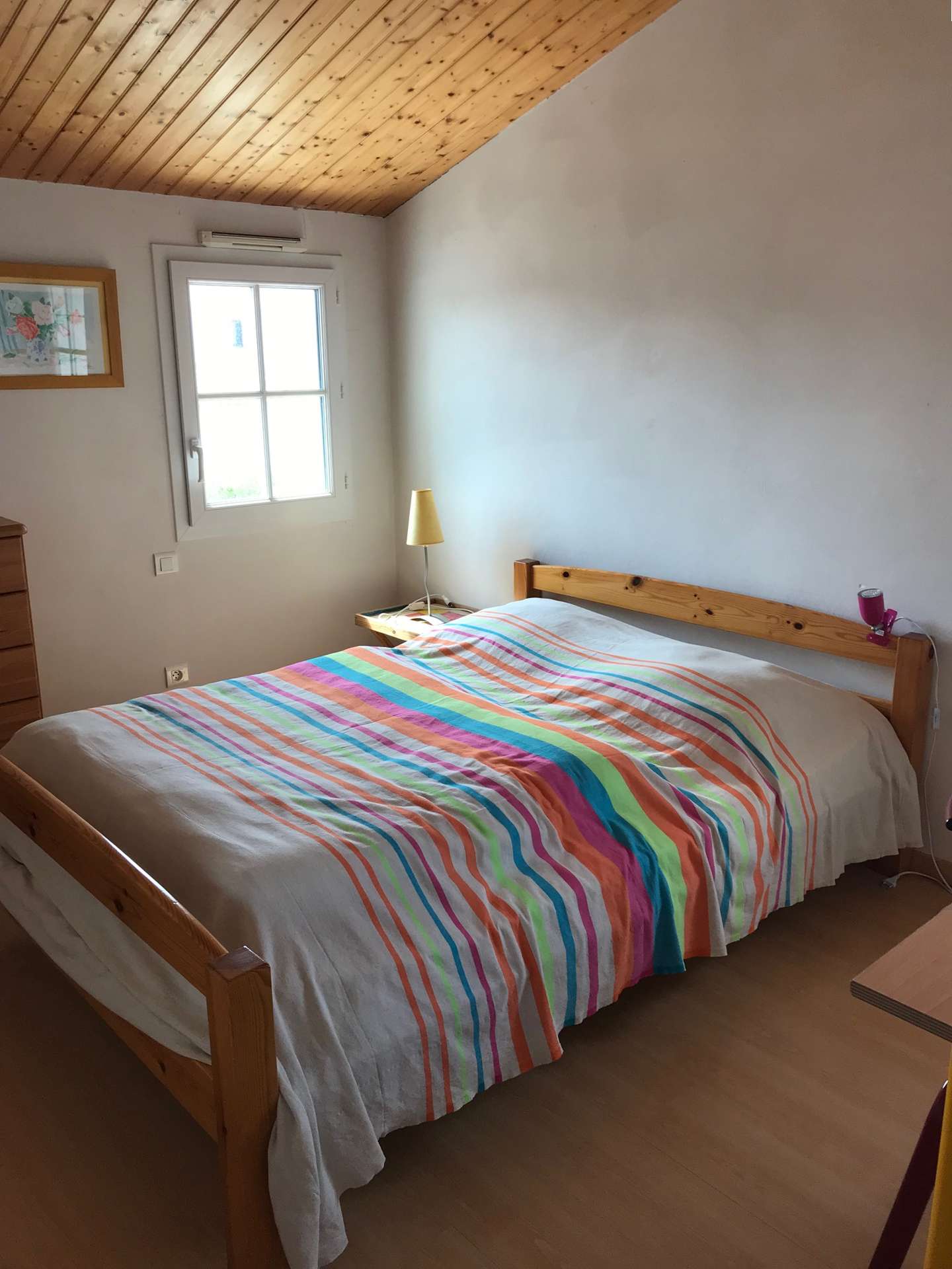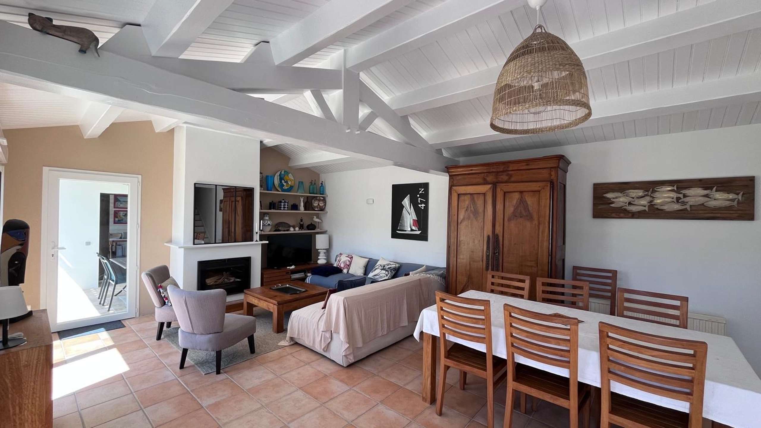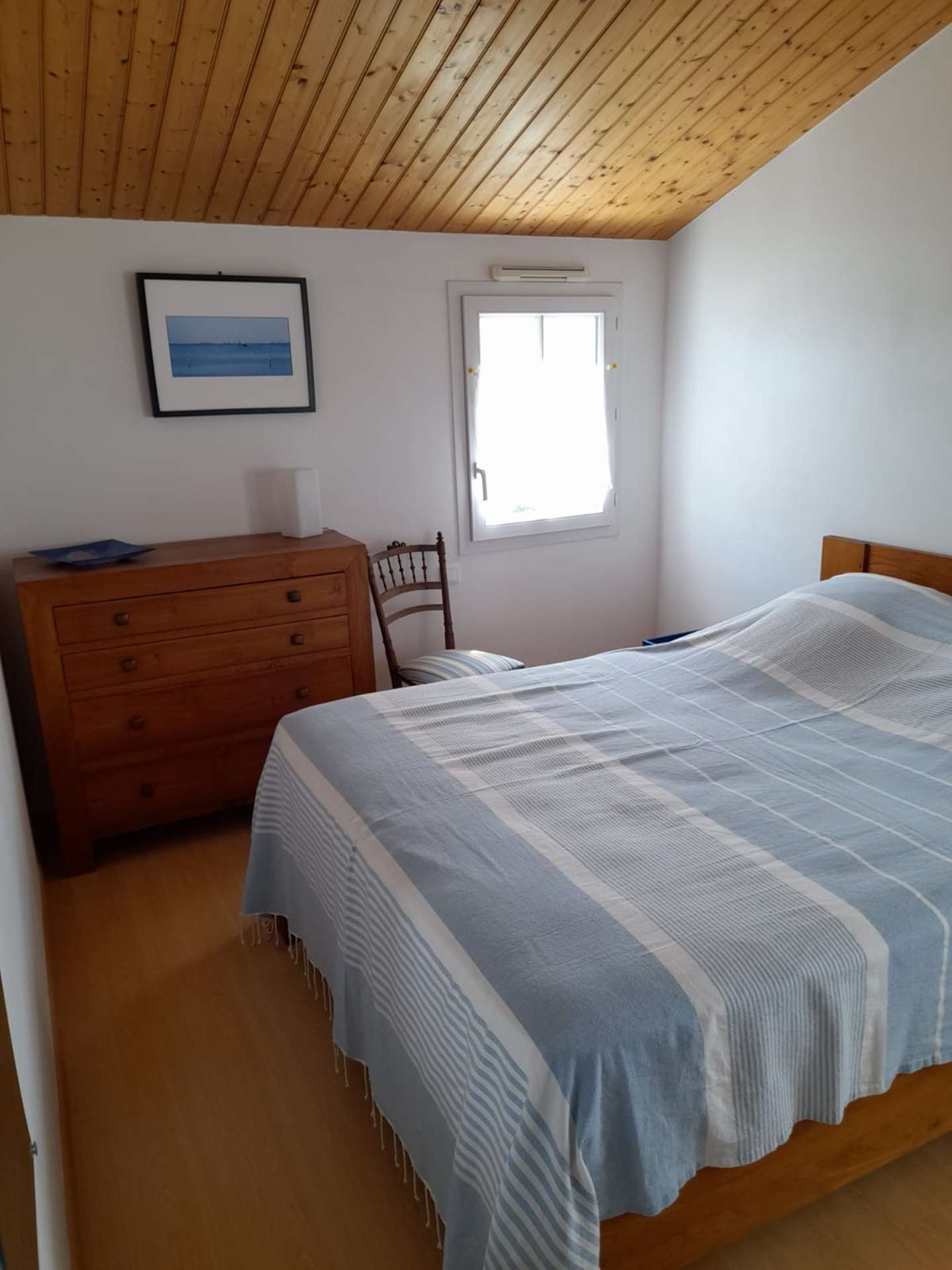 Maison 6 pièces - 150 m² environ- jusqu’à 10 personnes Située à 400 m de la plage et à 400 m du bourg de la Guérinière, cette jolie maison de vacances se compose en rez de chaussée, d'un séjour, d'un coin cuisine équipé, un cellier (réfrigérateur, congélateur, MO, placard), une chambre avec un lit double en 140 avec salle d'eau avec baignoire et douche, un wc indépendant et une chambre avec deux lits une place superposés. L'étage comprend trois chambres avec des lits de 140 chacune et une salle d'eau avec wc.